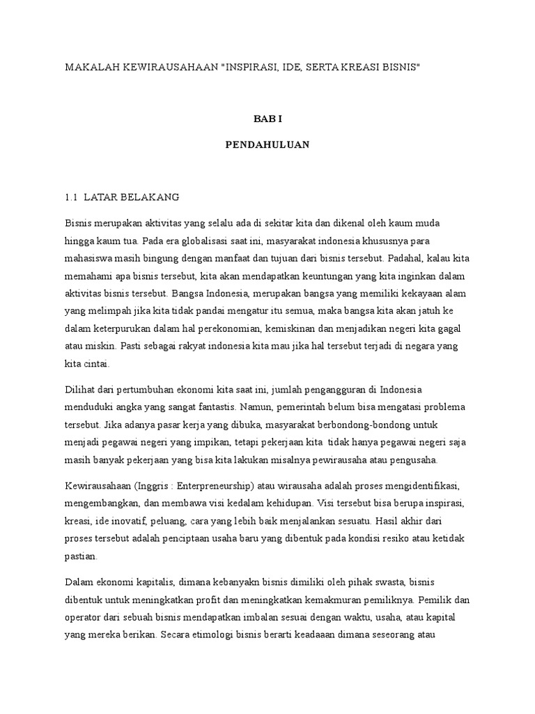 Latar Belakang Dalam menghadapi tantangan bisnis termasuk menghadapi costumer maka sebagai mahasiswa kita juga harus belajar dalam memasarkan suatu produk. Inti dari kewirausahaan adalah kemampuan untuk menciptakan sesuatu yang baru dan berbeda create new and different melalui berfikir kreatif dan inovatif. 2 DAFTAR ISI HALAMAN JUDUL 1 DAFTAR ISI 2 BAB I PENDAHULUAN 11 Latar Belakang 3 BAB II DESKRIPSI BISNIS 11 Deskripsi Produk dan Pasar 4 12 Demand Pasar dan Pesaing 5 BAB III ANALISA STRATEGI PASAR 11 Analisa SWOT 6. Leo Ariska H34110012 2011 Elga Fernanda H34110031 2011. Ada pengusaha yang sudah amat sukses dan kaya tapi tidak pernah menampilkan diri.